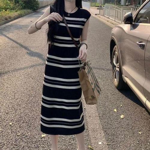 [옷자락] 여자 썸머 스트라이프 슬림핏 민소매 롱 원피스