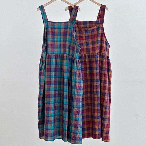 [옷자락] 여성 빅사이즈 체크 배색 스퀘어넥 롱 원피스 끈 여름