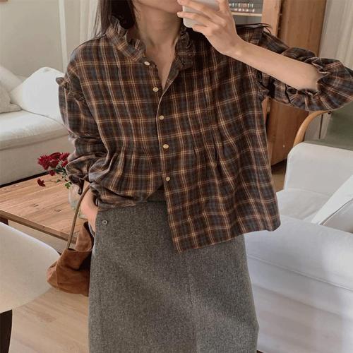 [퍼니걸스]루즈핏 기모 체크 프릴 긴팔 셔츠 블라우스 9203 여성의류