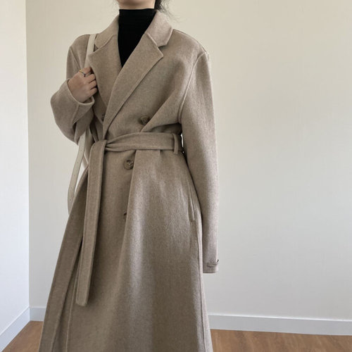 [시스티나]여성 겨울 핸드메이드 울 더블 벨트 하이넥 A라인 롱 코트