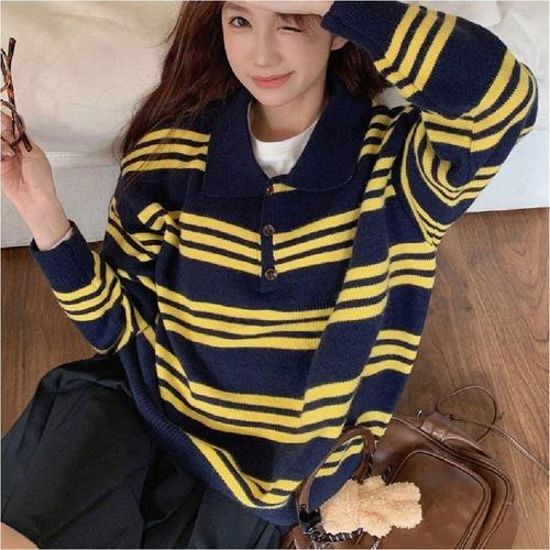 여성 스트라이프 니트 카라티 캐주얼 단가라 배색 티셔츠 WFKZVOS