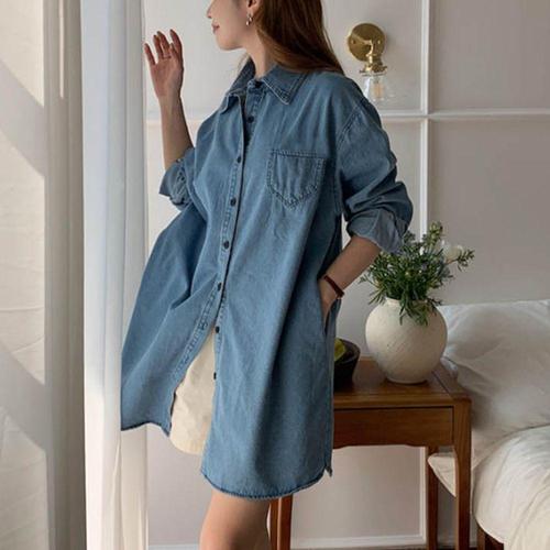 POMTOR 봄가을 여성 데님 원피스 미디 긴팔 빅사이즈 루즈핏 청원피스
