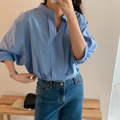 여자 오버핏 가오리 셔링 반팔 헨리넥 블라우스