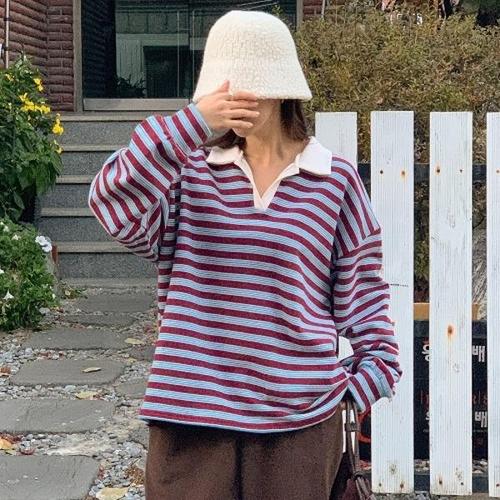 [신상오픈런]여성 스트라이프 오버사이즈 힙커버 오픈 카라 니트 스웨터