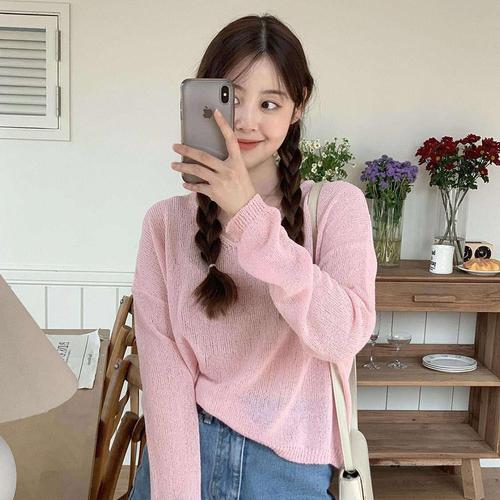 [샵앤][샵앤] 국산 여성 V넥 쿨링 부클 긴팔 심플 니트 티셔츠 JLE-WKN-4426-핑크