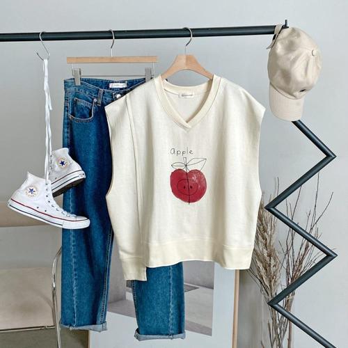 [옷자락]여성 사과 일러스트 절개 브이넥 루즈핏 민소매티