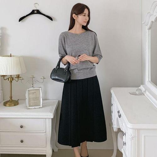 [미라클세븐]여성 보트넥 5부 반팔 니트 티셔츠 가을용 입술넥 울티셔츠