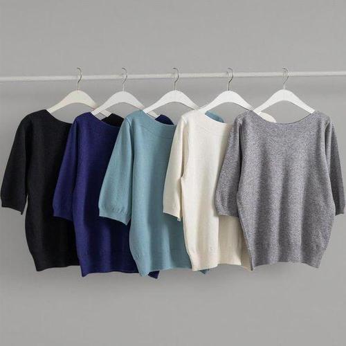 [신상오픈런]여성 보트넥 5부 반팔 니트 티셔츠 가을용 입술넥 울티셔츠