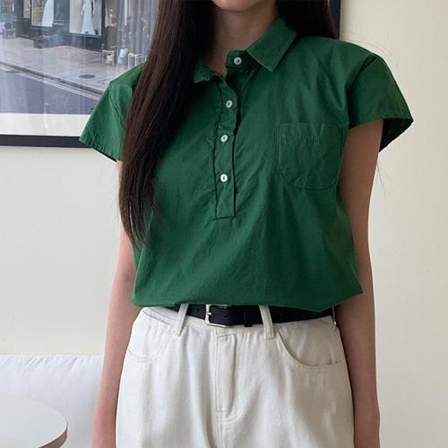 오드 BLO215 V넥 단작 캡소매 블라우스