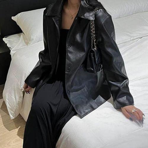 [마이모노샵] 여성 시크 캐주얼 오버핏 블랙 검정 레더 가죽 자켓