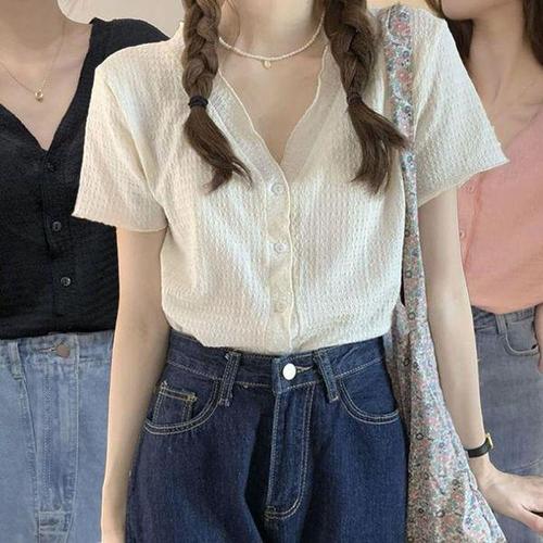 여성용 한국 니트 셔츠, 턴다운 칼라, 시크한 반팔 블라우스, 레트로 슬림, 올매치 여성용 크롭탑, 여름