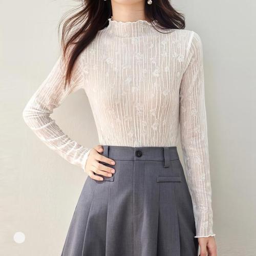 2019 여성용 할로우 아웃 레이스 블라우스, 터틀넥 메쉬 셔츠, 올 매치 레이디 상의, 풀오버, 브리프 이너, 907, 가을, 새로운 패션