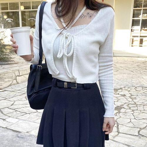 [옷자락]여성 가슴트임 볼레로 이너탑 리본 긴팔 티셔츠