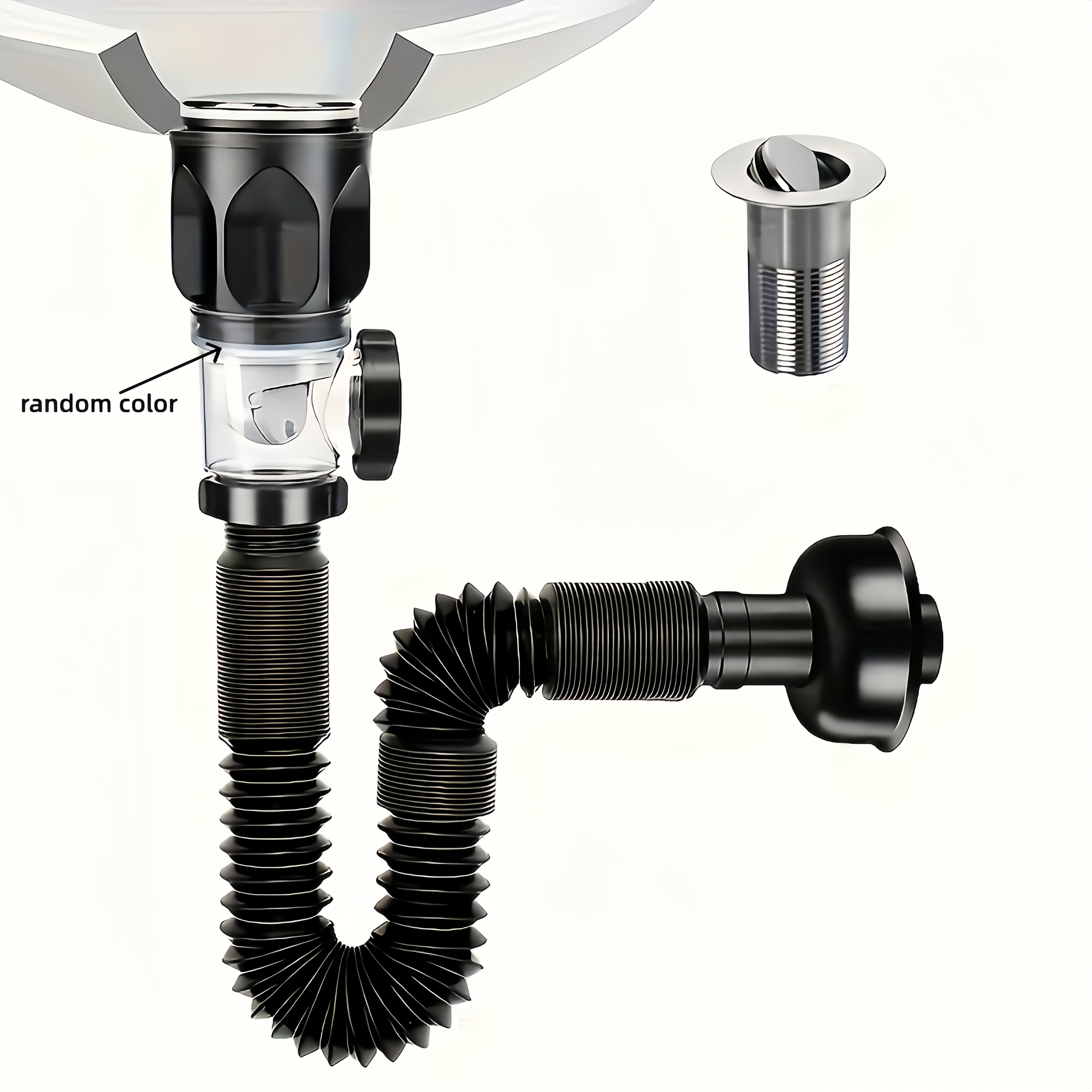 TEMU 1개 검정색 이중용途 배수 키트 - 직선형 및 수평형, 냄새 제어 기능, 두꺼운 금속 구조, RV 캠핑 트레일러 욕실용 조절 가능한 유연한 파이프