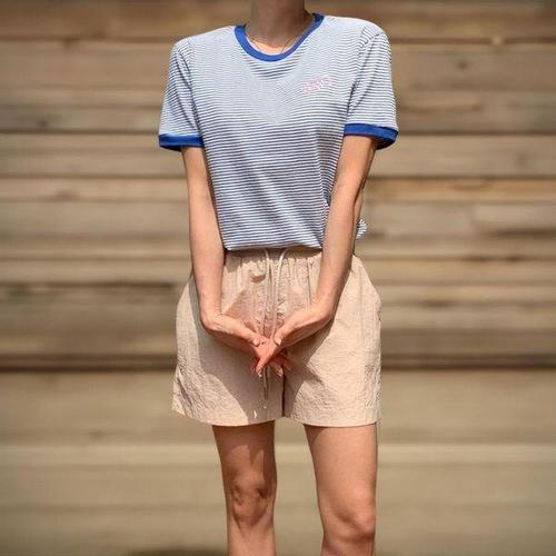 [다잇템]여성 줄무늬 잔골지 반소매 라운드 티셔츠