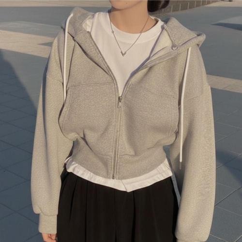 여성 겨울 기모 크롭 웜 베이직 무지 후드티 후드집업 WFL7JNS