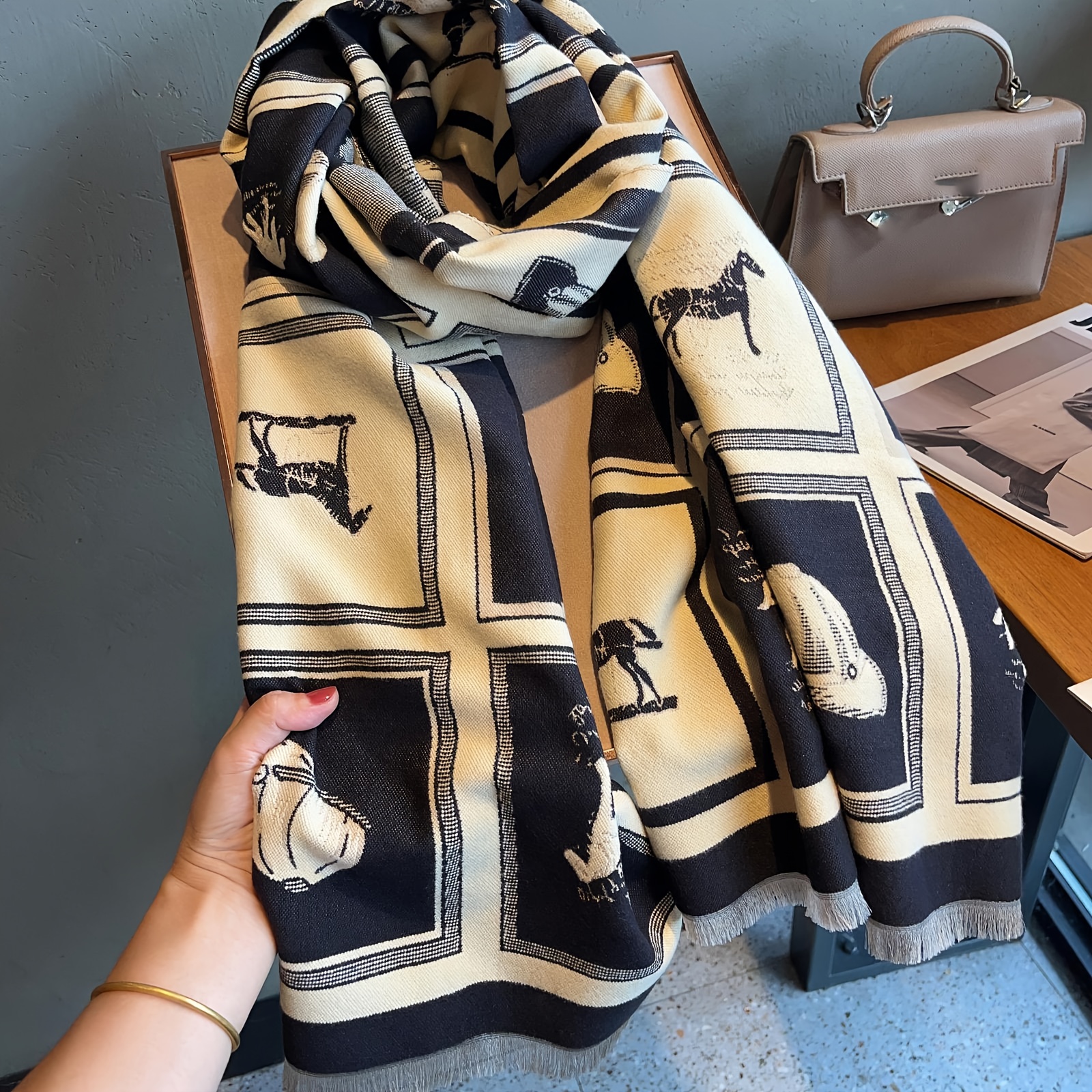 TEMU 여성용 스타일리시 베이지 & 블랙 기하학 패턴 스카프 - 긴, 두꺼운, 따뜻한 겨울 샤울, 캐주얼 외출에 완벽, 가을과 겨울에 적합, 캐주얼 겨울 착용 | 기하학 패턴 스카프 | 자카드 직조