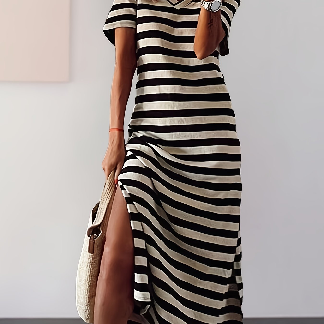 TEMU 여성용 스타일리시한 블랙 앤 화이트 맥시 드레스, 하이 슬릿, 반팔, 루즈핏, 폴리에스터, 봄/여름/가을에 완벽한 캐주얼 의상|루즈핏 드레스|폴리에스터 드레스|여름원피스|여성원피스|인견원피스