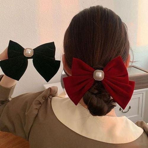 [에이치플러스몰]여성 벨벳 소재 스퀘어 진주 더블 리본 헤어 자동핀 자동핀 반묶음 회사원 포인트 리본 ..