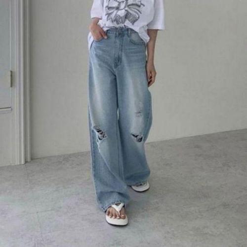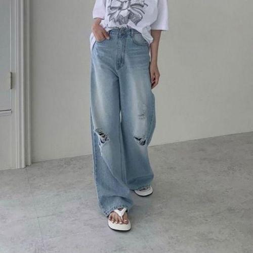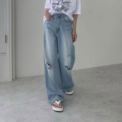 여성 찢어진 무릎컷 라이트블루 넓은 데님팬츠