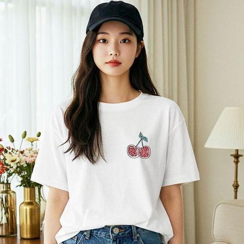 [셀러허브_여성트랜드패션]ONM 여성 티셔츠 체리 자수 반크롭 티셔츠