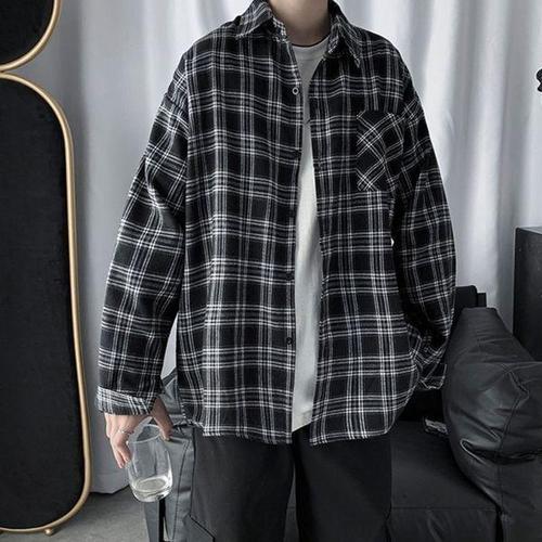[에이치플러스몰]스트릿 남자 체크 남방 오버핏 남성 긴팔 셔츠 남자셔츠 체크남방 체크셔츠