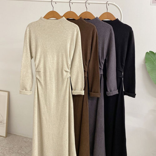 허니제이 / 컬림 반폴라 허리 핀턱 플레어 니트 롱 원피스(4color)