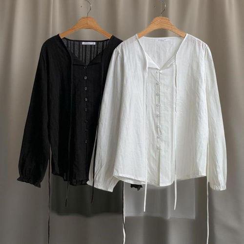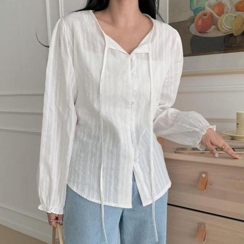 [신상오픈런]여자 스트라이프 버튼 롱타이 뒷리본 퍼프 면 블라우스