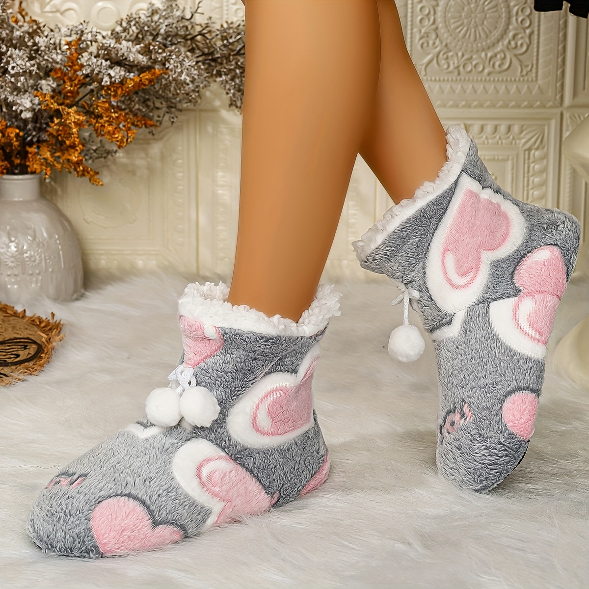 TEMU 여성용 겨울 실내 따뜻한 두꺼운 슬리퍼, 패셔너블하고 우아한 랜덤 하트 패턴, 작은 폼폼 토퍼와 패브릭 미끄럼 방지 밑창, 여성용 플러시 슬리퍼, 귀여운 슬리퍼, 여성용 슬립온 슬리퍼, 여성용 슬리퍼 플러스 사이즈