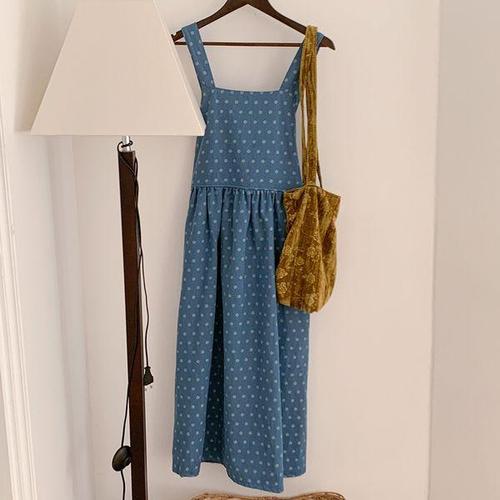 [다잇템]여자 청멜빵 큰사이즈 땡땡이 백리스 롱원피스