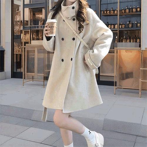 [르뚜앙]멍추 겨울 하이넥 울코트 더블버튼 A라인 벨트 하프코트 반코트 아이보리 데일리 오버핏 키작녀 ..