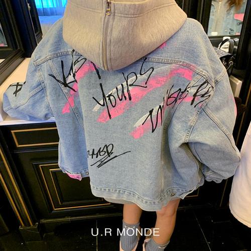 [유아몽드]핑크 레터링 자켓 오버핏 데님 자켓 그래피티 프린팅