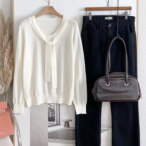 [옷자락] 여성 무지 컬러 양모 긴팔 타이넥 루즈핏 니트