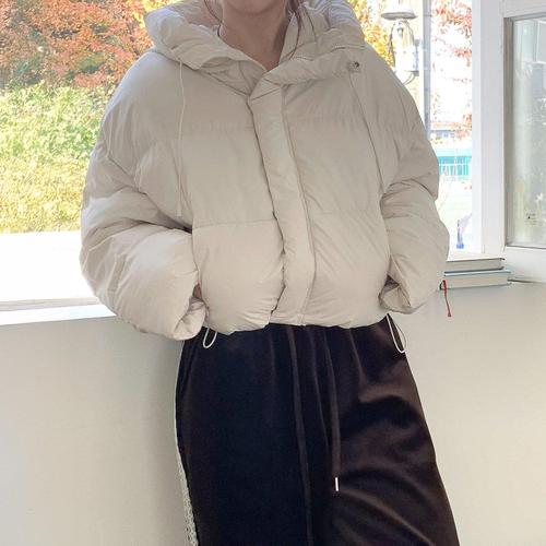 여성 숏패딩 하이넥 여유핏 후드 스트링 밑단 스트링