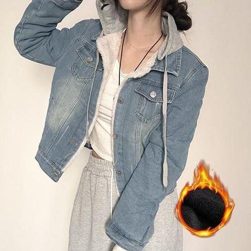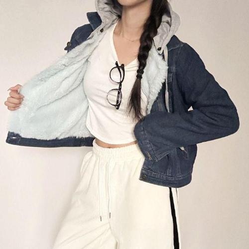 편한 공항 패션 털 안감 겨울 여자 청 데님 자켓 후드