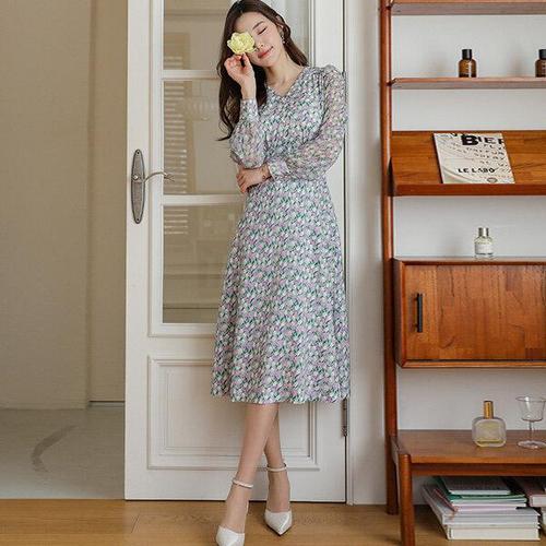 [스타일온미][루이스엔젤] 스프링퍼퓸 튤립 가든 쉬폰 배색 롱 플레어 원피스