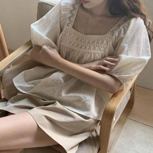 로엘란 뒷리본 스퀘어넥 퍼프소매 크롭 블라우스 R-C70