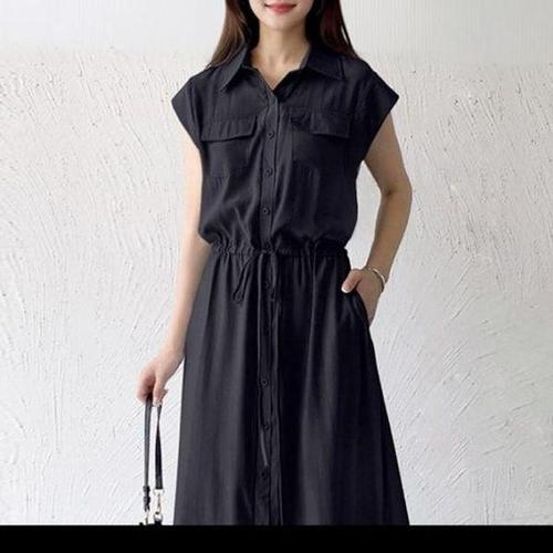 [미라클세븐]여성용 브이넥 포켓 민소매 롱 원피스 단추 누빔 캐주얼 드레스