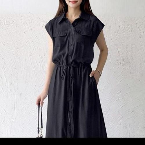 [옷자락] 여성 캐주얼 브이넥 포켓 민소매 단추 누빔 롱 원피스