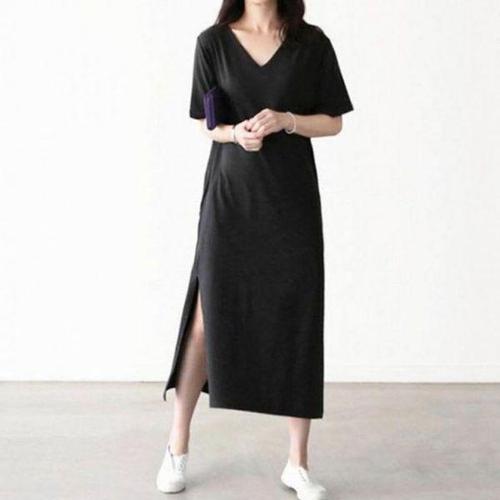 [에이치플러스몰]브이넥 베이직 밑단절개 롱원피스 신축성 올데이 포켓
