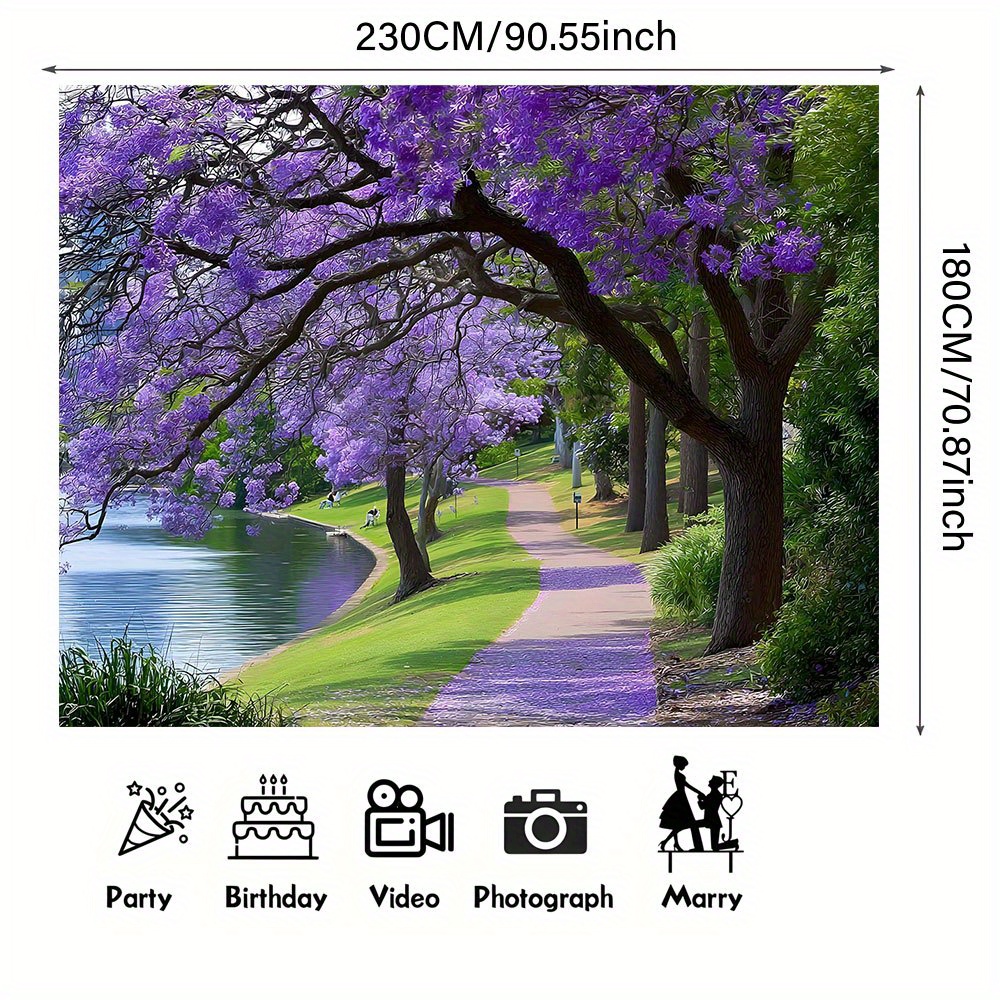 TEMU 1개 자카란다 나무 꽃 배경 - 호수 옆 보라색 꽃길, 우아한 자연 풍경 포토 배너 웨딩/생일/홈 데코용 - 재사용 가능한 폴리에스터 천 실내외 장식 (전기 불필요) - 고요한 호숫가 풍경 벽지, 거실/파티 장식, 생동감 있는 컬러 대비 디테일 프린트