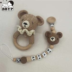 아기 딸랑이 크로 셰 뜨개질 곰 Teether 딸랑이 종소리 젖꼭지 체인 신생아 몬테소리 교육 장난감 나무 반지 아기 장난감