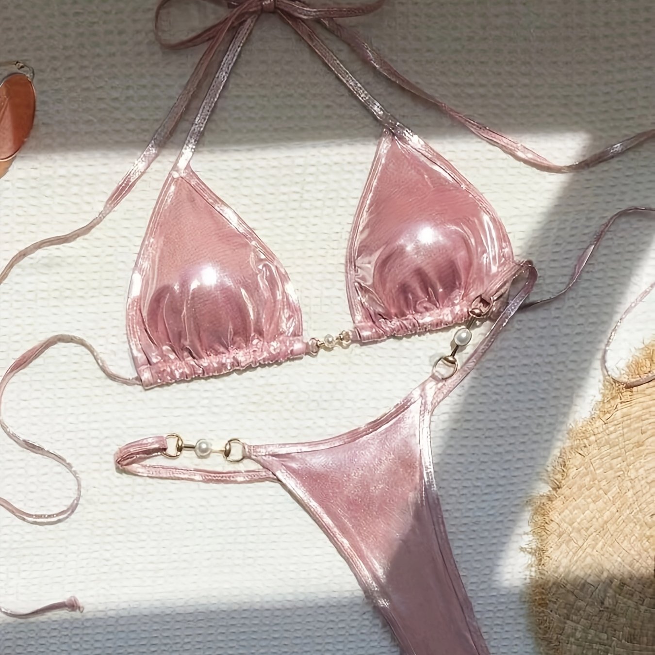 TEMU 2024 신상 여성 비키니 세트 섹시 탑 반짝이는 핑크 투피스 수영복