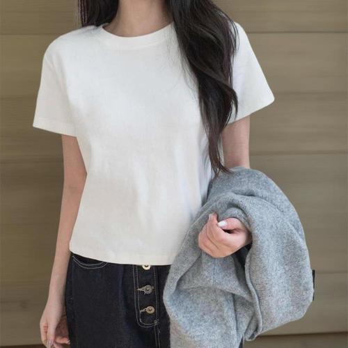 [옷자락]여자 라운드넥 피치기모 베이직 심플 크롭 반팔