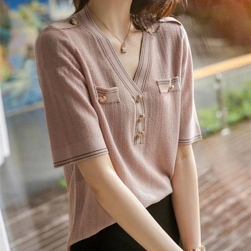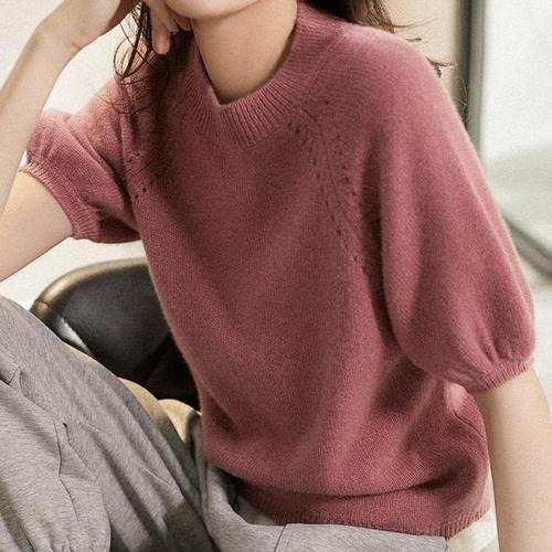 [드레스허그]로즈핑크 라운드 반팔 니트