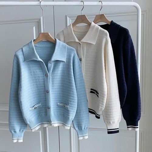 [옷자락]여자 단가라 하늘색 배색 브이 금장버튼 니트 가디건