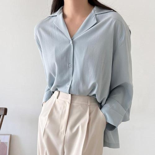 |CCH3AD1|찰랑블라우스 카라 오픈 v넥 루즈핏 하늘 분홍 봄남방