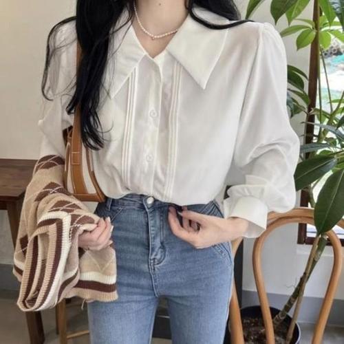 [JHP4OSQT_51IB]하늘하늘 소재 블라우스 어깨 셔링 셔츠