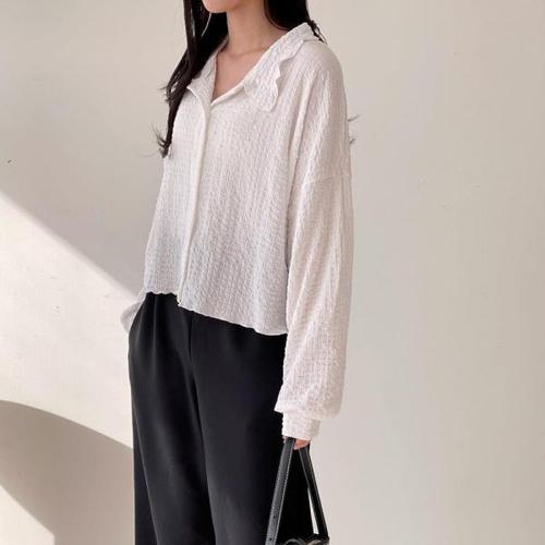 [옷자락]여자 얇은긴팔 하늘 레투스 와플 카라넥 물결 셔츠