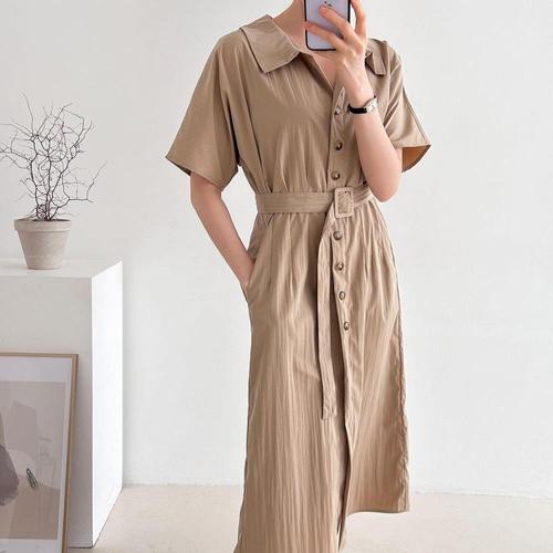 [옷자락]여자 여름하객룩 벨트 허리핀턱 슬림핏 셔츠 롱원피스_3